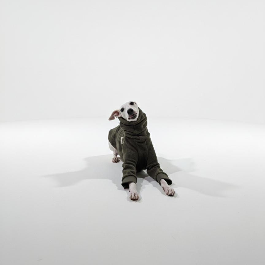 Lenyűgöző, mégis időtálló, letisztult és minimalista dizájn, amelyet raglán ujjak és hosszú garbó jellemez, kifejezetten olasz agarak és whippetek számára. A szabás gyönyörűen kiemeli az agarak veleszületett eleganciáját, míg a hasi részen található gumírozás jobb illeszkedést és maximális kényelmet biztosít, kiemelve a kutya karcsú sziluettjét.